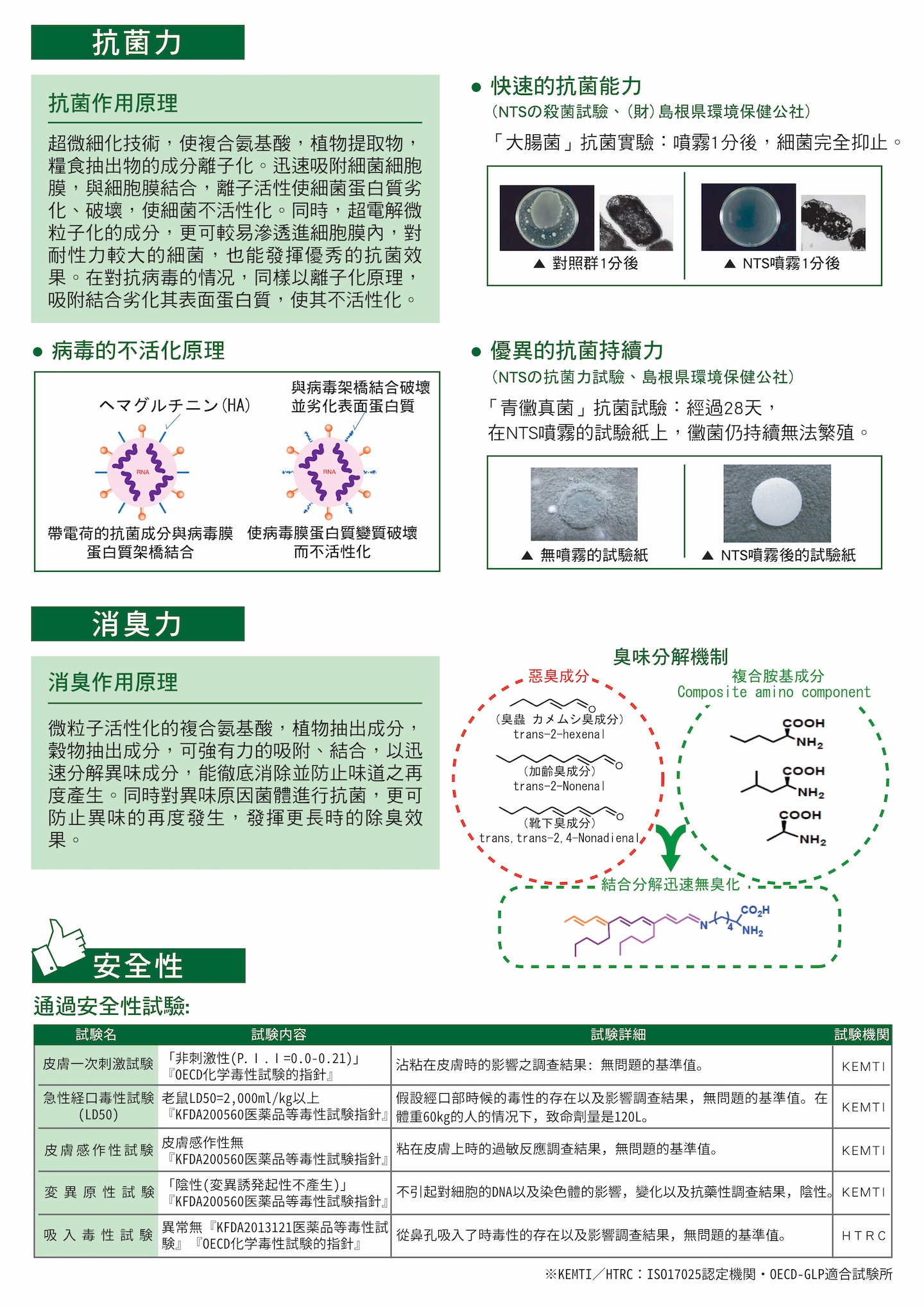 針對 COVID-19新冠病毒、H1N1流感病毒、SARS病毒、諾羅病毒、禽流感病毒及多種不同病毒、細菌分別於日本食品分析中心與各大權威檢驗機構進行實驗。