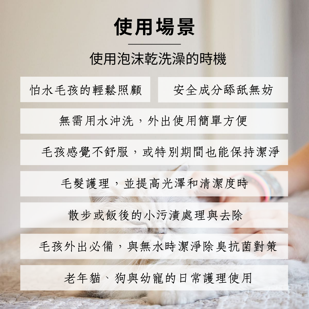 OneNyan泡沫乾洗澡,100%天然植萃配方,專為敏感族群設計的無添加天然成分,消毒、抗菌、除臭和改善毛髮光澤,簡單、快速、方便地清潔毛孩的髒污非常適合高齡貓和怕水的貓貓使用喔!洗護可以隨時進行,真的很好用!